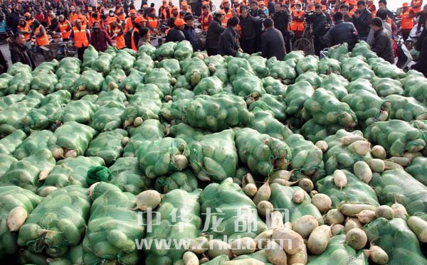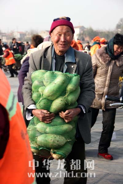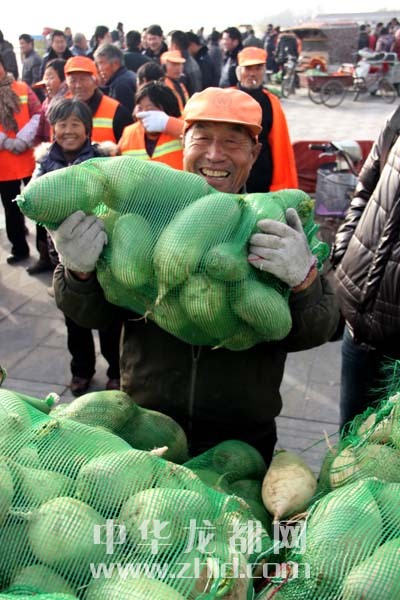 本報(bào)訊 淮陽(yáng)縣劉振屯鄉(xiāng)張老家村千萬(wàn)斤蘿卜滯銷(xiāo),村民叫苦不迭(見(jiàn)本報(bào)11月19日A05版報(bào)道)。經(jīng)過(guò)本報(bào)和愛(ài)心企業(yè)的多方努力,蘿卜滯銷(xiāo)情況已有所緩解。連日來(lái),本報(bào)聯(lián)合同和堂大藥店開(kāi)展的“愛(ài)心蘿卜”義賣(mài)、贈(zèng)送活動(dòng),已累計(jì)售出蘿卜23萬(wàn)斤。昨天,“愛(ài)心接力”從川匯區(qū)轉(zhuǎn)移至淮陽(yáng)。當(dāng)天,20萬(wàn)斤蘿卜免費(fèi)派送活動(dòng)在淮陽(yáng)縣太昊陵廣場(chǎng)啟動(dòng),1000余戶(hù)淮陽(yáng)貧困家庭喜領(lǐng)“愛(ài)心蘿卜”(如圖)。