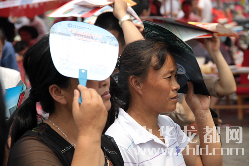 一考生家長(zhǎng)拿著宣傳單遮陽。
