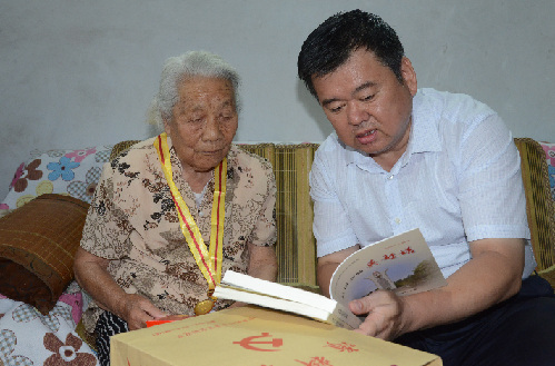 ????徐光一行先后來到抗戰(zhàn)老戰(zhàn)士老同志郭純義、張明鐸、王琪的家中,親切看望慰問他們,把黨和政府對抗戰(zhàn)老戰(zhàn)士老同志的關(guān)心傳遞到每個人心中。每到一處,徐光都與他們深入交談,了解他們的生活、起居、身體等情況,與老戰(zhàn)士、老同志一起回憶革命戰(zhàn)爭時期的崢嶸歲月,共話革命精神的傳承,祝愿他們健康長壽、生活幸福。慰問過程中,徐光滿懷崇敬之情,為抗戰(zhàn)老戰(zhàn)士老同志們佩戴由中共中央、國務(wù)院、中央軍委聯(lián)合頒發(fā)的“中國人民抗日戰(zhàn)爭勝利70周年”紀(jì)念章,送上慰問金和黨史書籍。徐光動情地說:“明天就是中國人民抗日戰(zhàn)爭和世界反法西斯戰(zhàn)爭勝利70周年紀(jì)念日,我代表市委、市政府來看望問候你們,并向你們致以崇高的敬意和良好的祝愿。抗戰(zhàn)年代,廣大老戰(zhàn)士、老同志出生入死、不怕犧牲、英勇奮斗,為奪取抗戰(zhàn)勝利立下了不朽的功勛,你們是人民的英雄、國家的功臣,沒有你們的犧牲奉獻(xiàn),就沒有我們今天的幸福生活,黨和人民永遠(yuǎn)不會忘記你們。紀(jì)念抗戰(zhàn)勝利,就是要弘揚(yáng)偉大的抗戰(zhàn)精神,凝聚起實(shí)現(xiàn)周口崛起、富民強(qiáng)市、全面建成小康社會的強(qiáng)大力量,不斷把周口的各項(xiàng)事業(yè)推向前進(jìn)。”