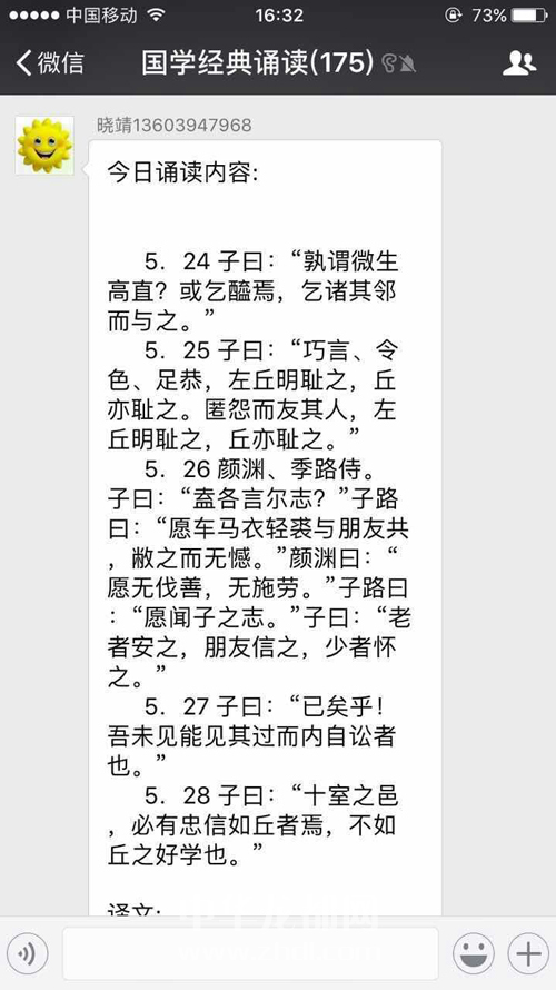 ????建立該微信群的是團(tuán)市委工作人員劉曉靖。劉曉靖告訴周口晚報記者,建立該微信群的目的是想讓大家多讀讀國學(xué)經(jīng)典,增加大家的文學(xué)涵養(yǎng),讓大家養(yǎng)成讀書的習(xí)慣?!皠傞_始只有十幾個人,大家有些不好意思,有的人覺得自己讀得不好張不開口,我就做一些示范,引領(lǐng)大家誦讀。不久,加入微信群的人多了,通過幾個人帶動,大家誦讀的就多了?!眲跃刚f,讀的方式就是大家通過微信的語音功能,讀一些《論語》中的經(jīng)典句子。過了一段時間,大家對這種方式越來越認(rèn)可,加入該微信群的人也越來越多,人數(shù)從剛開始的十幾個人增加到近200人。現(xiàn)在,該微信群里不但有電臺、電視臺的專業(yè)主持人,而且有一些學(xué)者。以前拿不準(zhǔn)的字,現(xiàn)在都會有人講解,大家也有了學(xué)習(xí)對象。這個微信群從成立到現(xiàn)在,《弟子規(guī)》、《大學(xué)》、《中庸》、《論語》已讀一遍,四書里面只剩下《孟子》還沒有讀。