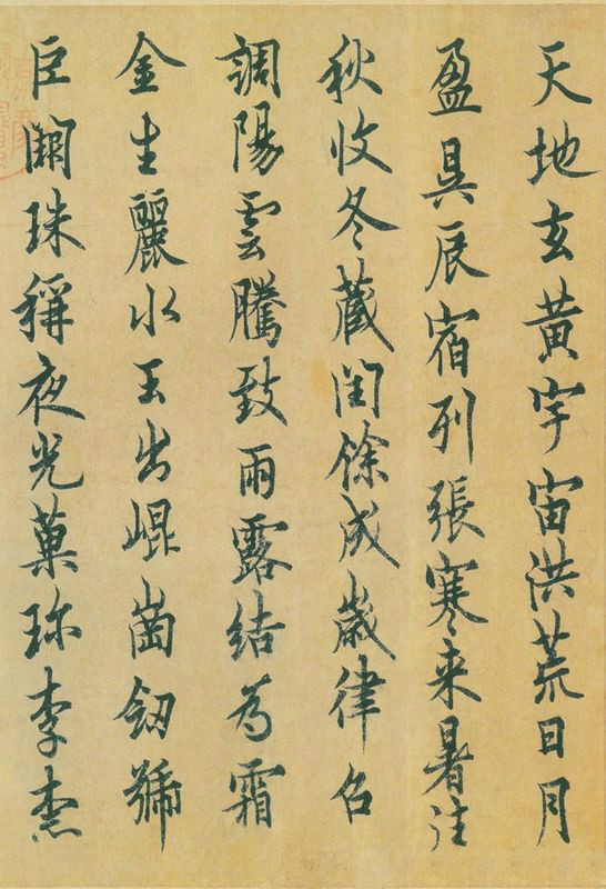 ????《千字文》第一部分從天地開辟講起。有了天地,就有了日月、星辰、云雨、霜霧和四時(shí)寒暑的變化;也就有了孕生于大地的金玉、鐵器(劍)、 珍寶、果品、菜蔬,以及江河湖海,飛鳥游魚;天地之間也就出現(xiàn)了人和時(shí)代的變遷。在此,《千字文》講述了人類的早期歷史和商湯、周武王時(shí)盛世的表現(xiàn),即文中所說的“坐朝問道,垂拱平章。愛育黎首,臣伏戎羌。遐邇一體,率賓歸王。鳴鳳在竹,白駒食場(chǎng)。化被草木,賴及萬方”。