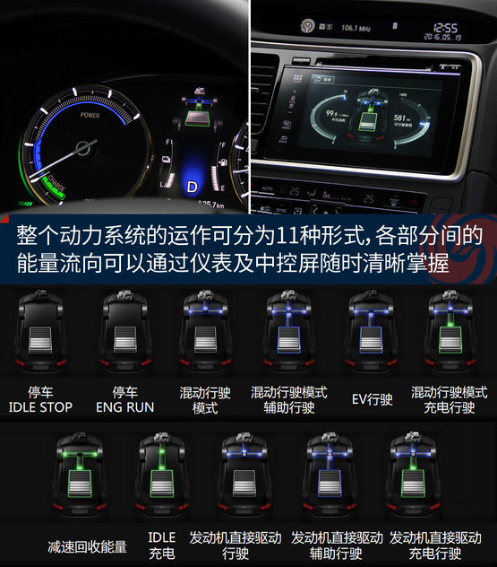 儀表也需要重新設(shè)計,左側(cè)的轉(zhuǎn)速表變成了動力顯示表。不過這跟雷克薩斯采用的液晶顯示方式不同,實體儀表只能固定在動力顯示的樣子,愛駕駛的人習慣看的轉(zhuǎn)速表就沒法兼得了。此外,儀表液晶屏和中控大屏都提供了能流量顯示功能,方便駕駛者隨時了解車輛能量的流動情況,也是個突顯逼格的利器。