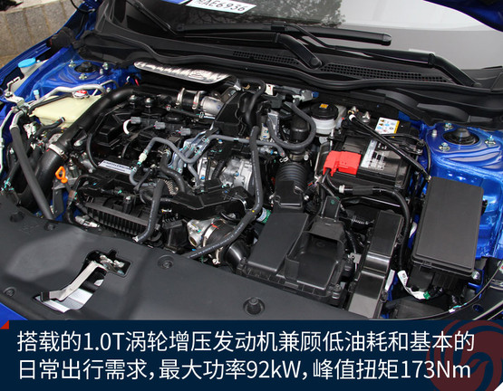 思域180TURBO車型搭載的是1.0升三缸渦輪增壓發(fā)動機,賬面上擁有的最大功率為92kW/5500rpm,最大扭矩達到了173Nm/2000-4500rpm,基本能夠達到主流1.8升自吸發(fā)動機的水平。與之匹配的CVT無級變速器大家都比較熟悉,在本田品牌的車型中已經(jīng)有著廣泛的應(yīng)用。