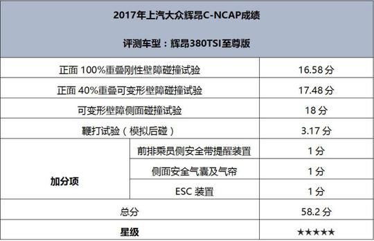 ????????輝昂成為“國(guó)家名片”,出色的安全性能同樣至關(guān)重要。在2017年度C-NCAP第一批車(chē)型的評(píng)價(jià)結(jié)果中,輝昂獲得58.2的高分,是C-NCAP 2015年版規(guī)則實(shí)施以來(lái)的最高分。