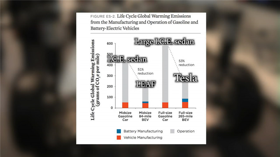 ????????這張表更加清晰,分別統(tǒng)計(jì)了普通內(nèi)燃機(jī)汽車(25MPG=百公里油耗9.4升)、特斯拉Model X 90D、Model S 75D和聆風(fēng)(電池容量24kWh)在車輛生產(chǎn),燃油/電能生產(chǎn)過(guò)程以及駕駛使用過(guò)程中的排放,可以看到,盡管電動(dòng)車在車輛生產(chǎn)、電能生產(chǎn)過(guò)程中產(chǎn)生的排放更高,但行駛工程中的零排放仍然使其在整個(gè)生命周期中的排放更低。