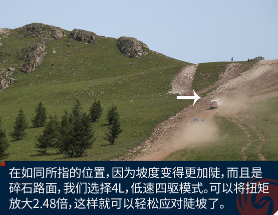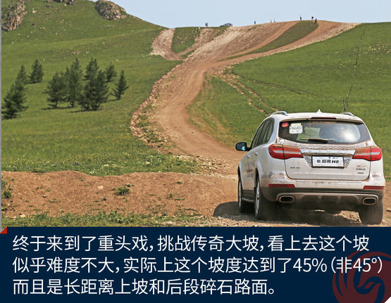 ????????經(jīng)過(guò)刺激的涉水越野,我們終于來(lái)到了此行最難的挑戰(zhàn)地,傳奇大坡。這條上山的土路從圖片上看起來(lái)不陡,實(shí)際上已經(jīng)達(dá)到了45%的坡度。人爬起來(lái)都?xì)獯跤?。而且難度大的原因是兩點(diǎn),一個(gè)是超長(zhǎng)距離的大上坡,另一個(gè)是后端是碎石路面。你想靠沖坡根本行不通,如果動(dòng)力不足最終是無(wú)法登頂?shù)?。H8不僅動(dòng)力充沛而且有4L,低速四驅(qū)模式,而且博格華納雙速TOD可以隨時(shí)分配動(dòng)力傳遞到前后軸,保障了有抓地力的輪胎有驅(qū)動(dòng)力。
