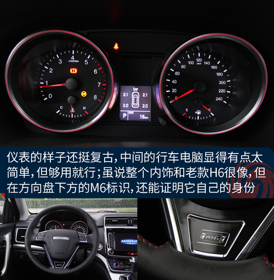 ????????車上的機械液壓助力轉向的力度有點沉,這點和老款H6特別的相似,長時間在低速行駛或者移庫挪車的時候挺廢胳膊,大老爺們長時間開都覺得酸,更何況瘦小的小女孩呢!所以從這點看出,M6會從配置以及更低的價格來吸引消費者,至于想這些其他的問題,大伙就別太吹毛求疵了,畢竟魚和熊掌不可兼得。