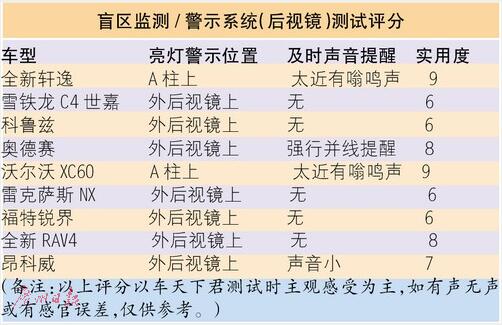 在測試后視鏡盲區(qū)時,車天下君隨機采訪了不少車主。車主居然有兩種意見:有一兩個剛提車的車主覺得,實在是個“雞肋”功能,然而很快被其他體驗過一段時間的車主“否定”了——非常實用,而且有依賴性?!耙呀?jīng)成功提醒我,讓我避免了很多次并線危機了?!逼渲幸晃卉囍魇沁@么說的。有車主甚至感嘆,這個功能常常是“頂配車型才有,太可惜了。應該成為標配才對?!辈贿^,車天下君也發(fā)現(xiàn),這個功能的出現(xiàn),也讓很多車主養(yǎng)成了不喜歡打轉(zhuǎn)向燈的壞習慣,因為他們習慣性認為——沒有警示就意味著盲區(qū)無車,可以放心變道。當然,即便有了這項后視鏡盲區(qū)監(jiān)測/警示功能,記者還是提醒各位車主,每次上車都要調(diào)好后視鏡,畢竟后視鏡盲區(qū)監(jiān)測/警示功能只是輔助,只有你的“肉眼”和系統(tǒng)共同監(jiān)視路況,才是最安全的駕駛方式。而且,要注意的是,變道時,一定要打轉(zhuǎn)向燈,建議最好等轉(zhuǎn)向燈亮3次以上才開始并道,因為這樣后車才有充分的準備時間!