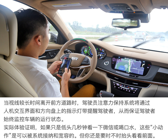 ????????原則上駕駛員應(yīng)該緊盯前方,時刻準(zhǔn)備著接管汽車的控制權(quán)。但實(shí)際上基于ACC自適應(yīng)巡航系統(tǒng)的Super Cruise?超級巡航為行駛中的汽車提供了充足的“安全緩沖余量”。在底特律郊區(qū)高速公路上實(shí)際體驗(yàn)證明,視線短暫的離開正前方(大約3-5秒之內(nèi))處于系統(tǒng)安全的“可接受”范圍內(nèi),比如喝水、吃東西或者調(diào)節(jié)空調(diào)多媒體娛樂系統(tǒng),這些操作都沒什么問題。