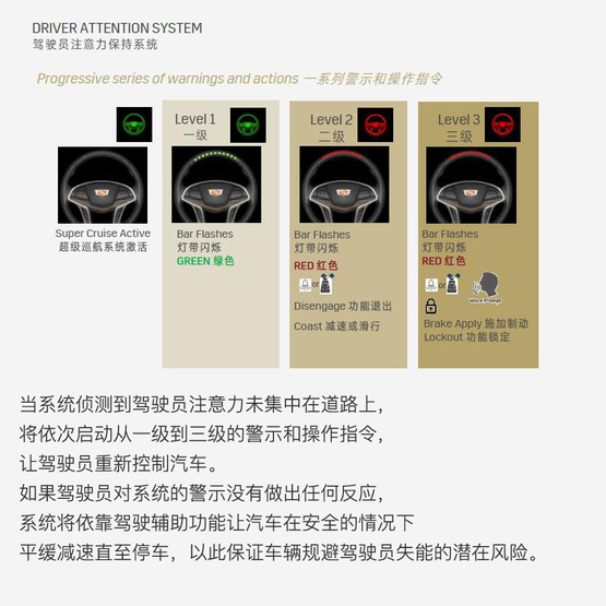 ????????若這個級別的警示還不能“喚醒”駕駛者,超級巡航系統(tǒng)將自動開啟雙閃、利用車輛輔助駕駛系統(tǒng)控制汽車逐漸減速并在路邊停車,然后OnStar安吉星工作人員將會通過遠(yuǎn)程對話介入以防止駕駛者因?yàn)椤笆堋痹斐筛嗖豢深A(yù)知的危險。