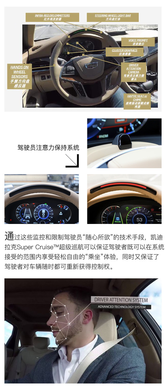 ????????但問題是,當(dāng)一臺車自己好好的行駛在高速公路上,人性驅(qū)使下的駕駛員很容易把注意力轉(zhuǎn)移到其它地方,這就造成了極大的安全隱患。所以凱迪拉克Super Cruise?超級巡航系統(tǒng)最與眾不同的地方,也是讓我覺得最有價推廣價值的設(shè)計(jì)理念,是通過駕駛員注意力保持系統(tǒng)與高精度地圖數(shù)據(jù)緊密結(jié)合?,主動監(jiān)測駕駛員的狀態(tài)并做出及時回應(yīng)。這套系統(tǒng)能督促駕駛者始終保持對車輛運(yùn)行狀態(tài)的有效監(jiān)控,這給其釋放雙手的駕駛輔助功能帶來更安全、更自信的使用體驗(yàn)。