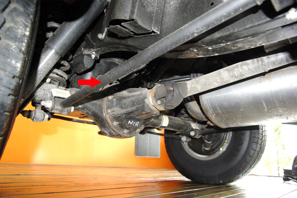 ????上圖中橙黃色箭頭為前軸的限位拉桿,不僅限制前軸自身發(fā)生扭轉(zhuǎn),也可對(duì)前軸的相對(duì)車(chē)架的前后位置進(jìn)行限制。藍(lán)色箭頭為前防傾桿,目測(cè)粗細(xì)并不算大,相信這也跟衛(wèi)士不看重公路性能有關(guān)。