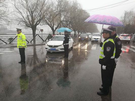 中華龍都網(wǎng)訊 (周口報(bào)業(yè)全媒體記者 侯俊豫 通訊員 王勇) 3月1日,淮陽縣在羲皇賓館上午下午分別召開全縣政法工作會(huì)議和紀(jì)檢監(jiān)察會(huì)議,參會(huì)人員分別達(dá)千余人。會(huì)議緊張進(jìn)行了一天,淅淅瀝瀝的小雨下了一天。負(fù)責(zé)道路保障任務(wù)的交警大隊(duì)城市中隊(duì)民警冒雨執(zhí)勤從黎明到天黑,交警真的成了“澆警”,但執(zhí)勤民警克服惡劣天氣的影響,圓滿完成了會(huì)場(chǎng)附近道路保障工作。
