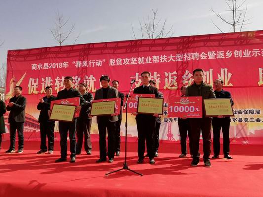 會上,縣委、縣政府授予商水縣紫金置業(yè)、周口正念創(chuàng)業(yè)孵化器、河南省元來農(nóng)業(yè)科技、商水縣萬和園花卉種植合作社等公司“返鄉(xiāng)農(nóng)民工示范企業(yè)”榮譽稱號,授予王鵬飛、李紅雷、蘇桂州、宋銀花、劉天華、張金波、任聯(lián)軍、葉天力、羅國昌、劉書顯等“返鄉(xiāng)創(chuàng)業(yè)標(biāo)兵”榮譽稱號。