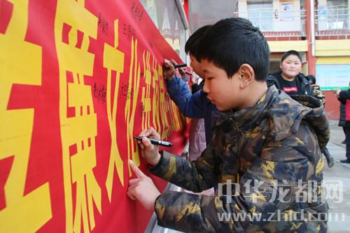 中華龍都網(wǎng)訊(周口報(bào)業(yè)全媒體記者 韋偉 通訊員 王佳佳 辛曼 攝)今年是毛澤東“向雷鋒同志學(xué)習(xí)”題詞55周年。3月5月,沈丘縣紀(jì)委監(jiān)委聯(lián)合縣義工聯(lián)走進(jìn)沈丘二高、河南小學(xué),開展“孝廉文化進(jìn)校園”活動,旨在弘揚(yáng)雷鋒精神和“孝善儉廉”的美德。圖為:學(xué)生們在“弘揚(yáng)雷鋒精神,做‘孝善儉廉’美德少年”條幅前簽字。