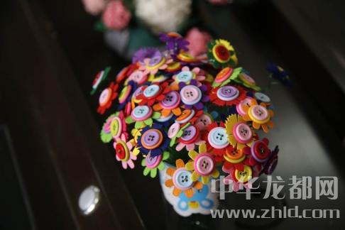 圖為3月12日,項城市特殊教育學(xué)校的孩子用扣子和針線做好的手工花卉,十分漂亮。