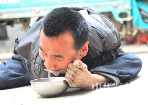 媽媽乘上一碗放在地上,紅印坐在墊子上,用腳夾著勺子,彎下腰來吃得很香??吹郊t印吃飯那么費力,在場人心里酸酸的,為紅印自強不息所打動著??墒钱?dāng)初娘倆可沒少流眼淚,李新蘭發(fā)現(xiàn)兒子兩只腳是靈活完好的,就開始訓(xùn)練他用腳吃飯、洗臉。養(yǎng)大一個正常的孩子尚且不易,何況是張紅印這樣的孩子?李新蘭一遍遍地教,年幼的張紅印一遍遍地學(xué)。難為到受不了時,娘倆就抱在一起哭。