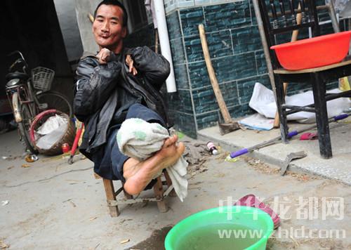 “這孩子40多年來,沒住過院,沒打過針,頭疼發(fā)燒會給媽媽示意,拿幾片藥一吃就好,這孩子命硬,一冬天也不洗回澡,到夏天爸爸媽媽幫他洗洗,有時候衣服一月才換一次。”鄰居張大媽說道?,F(xiàn)在紅印可以靈活的用雙腳幫媽媽做一些事情了。