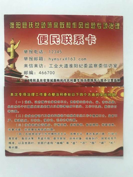 今年4月,淮陽(yáng)縣扶貧領(lǐng)域腐敗和作風(fēng)問(wèn)題專(zhuān)項(xiàng)治理全面啟動(dòng)。為確保專(zhuān)項(xiàng)治理取得實(shí)效,縣紀(jì)委監(jiān)委印制發(fā)放“便民聯(lián)系卡”,進(jìn)一步加大宣傳力度,暢通信訪舉報(bào)渠道。他們統(tǒng)一制作的扶貧領(lǐng)域腐敗和作風(fēng)問(wèn)題專(zhuān)項(xiàng)治理便民聯(lián)系卡,上面印有專(zhuān)項(xiàng)治理工作重點(diǎn)整治和查處的4個(gè)方面內(nèi)容。具體包括黨委、政府履行主體責(zé)任不力,脫貧攻堅(jiān)工作不扎實(shí),敷衍應(yīng)付;扶貧部門(mén)及相關(guān)職能部門(mén)脫貧攻堅(jiān)工作中不作為、慢作為、亂作為等;扶貧領(lǐng)域發(fā)生貪污侵占,虛報(bào)冒領(lǐng),截留挪用等問(wèn)題。聯(lián)系卡公布了舉報(bào)電話(huà)和來(lái)信來(lái)訪地址,方便群眾對(duì)黨員干部和部門(mén)的監(jiān)督。