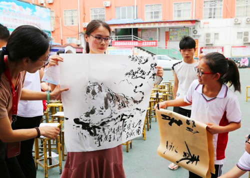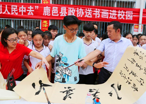 中華龍都網(wǎng)訊(周口報業(yè)全媒體記者 李瑞才 通訊員 孫廣合 胡洪濤)6月26日上午,鹿邑縣政協(xié)和縣文聯(lián)聯(lián)合開展“到人民中去”送書畫進(jìn)校園活動,組織10余位知名書畫家走進(jìn)校園,現(xiàn)場揮毫潑墨,為師生義寫字畫。