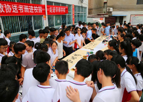 書畫家于連河、岳新華、夏有慶、王廣峰等人現(xiàn)場為師生書寫字畫近千幅,學(xué)生們圍在寫臺邊一邊求字畫一邊欣賞書畫技藝?!拔覀兘M織書畫家、藝術(shù)家到人民中去,為群眾送去藝術(shù)享受和書面精品,把精神食糧送給人民。”縣文聯(lián)主席王亞飛告訴記者。