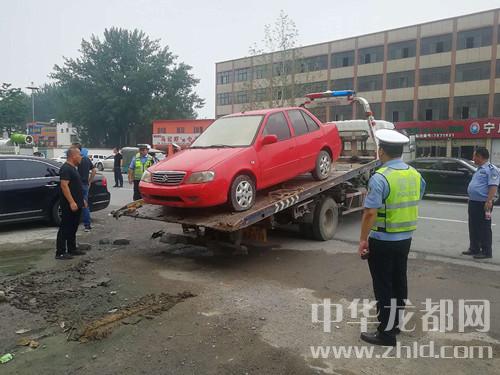 在市區(qū)七一路與建安路交叉口附近,有一輛銀色“僵尸車”,左前方的輪胎沒氣,車身有些傾斜?!斑@車停這已經(jīng)很久了,趕緊給它拖走吧?!敝苓吘用裾f。距離這里不遠(yuǎn)處的大地華府附近,一輛紅色“僵尸車”趴在水窩里。隨著謝偉一聲令下,兩輛“僵尸車”被拖走。