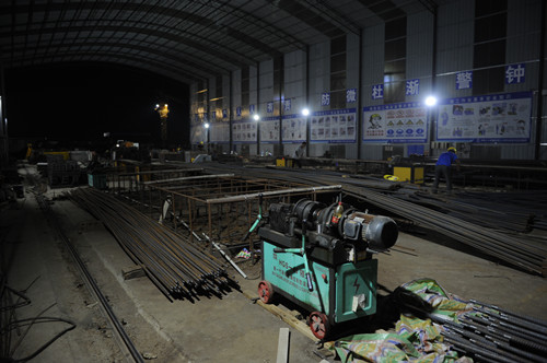 當(dāng)晚21時(shí)許,記者在泰和家園施工現(xiàn)場看到,鋼筋加工棚的工人們正在進(jìn)行鋼筋的切割,他們?cè)跒槊魈焓┕?zhǔn)備鋼筋材料。A1#樓正在進(jìn)行墊層的澆筑工作,A8#樓正在進(jìn)行負(fù)一層及周邊地庫的鋼筋綁扎及模板加固工作,A9#樓正在進(jìn)行負(fù)一層墻柱鋼筋及模板內(nèi)架搭設(shè)工作。現(xiàn)場2臺(tái)鋼筋切割機(jī)在不停地運(yùn)轉(zhuǎn),9臺(tái)塔吊在持續(xù)工作,40余名施工人員在場地內(nèi)各司其職,緊張而有序地趕進(jìn)度,整個(gè)施工現(xiàn)場如火如荼。