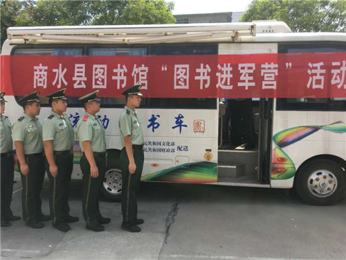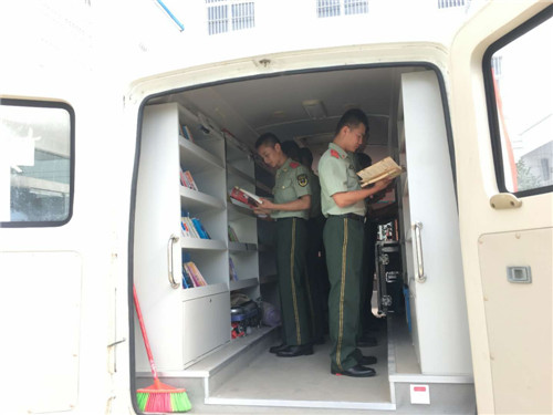 文化擁軍是商水縣圖書館的優(yōu)良傳統(tǒng)。當天,流動圖書車一來到縣武警中隊駐地,士兵們便不約而同圍了過來,有的走上圖書車尋找喜愛的圖書,有的則直接坐在車上,認真翻閱書籍。戰(zhàn)士小劉表示:“我最喜歡人物傳記方面的圖書,今天他們送來了許多。我要充分利用這些圖書,讀好書、立好志、當好兵,為實現(xiàn)中國夢、強軍夢和祖國的國防建設(shè)作出應(yīng)有貢獻。”