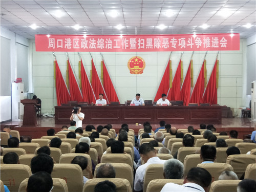 9月6日,周口港區(qū)召開政法綜治工作暨掃黑除惡專項斗爭推進(jìn)會議。港區(qū)黨委書記孫紅偉出席會議并講話,紀(jì)委書記尚紅偉主持會議。港區(qū)公安分局政委何學(xué)民對掃黑除惡工作做具體部署。港區(qū)直屬各單位、市直派駐機構(gòu)負(fù)責(zé)人,公安、城管、消防、李埠口鄉(xiāng)全體黨員干部,各行政村主要負(fù)責(zé)人和村治保主任等近300人參加會議。