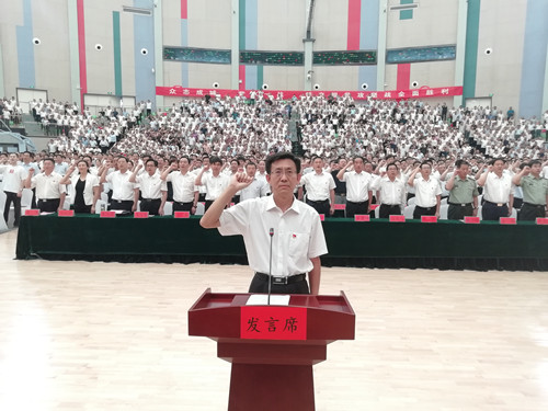 “不忘初心、牢記使命………爭(zhēng)分奪秒、苦干實(shí)干,堅(jiān)決打贏脫貧攻堅(jiān)戰(zhàn)!”隨著縣委書(shū)記馬明超領(lǐng)誓,與會(huì)的約4000名干部集體莊嚴(yán)宣誓??h委副書(shū)記、縣長(zhǎng)王毅主持大會(huì)。