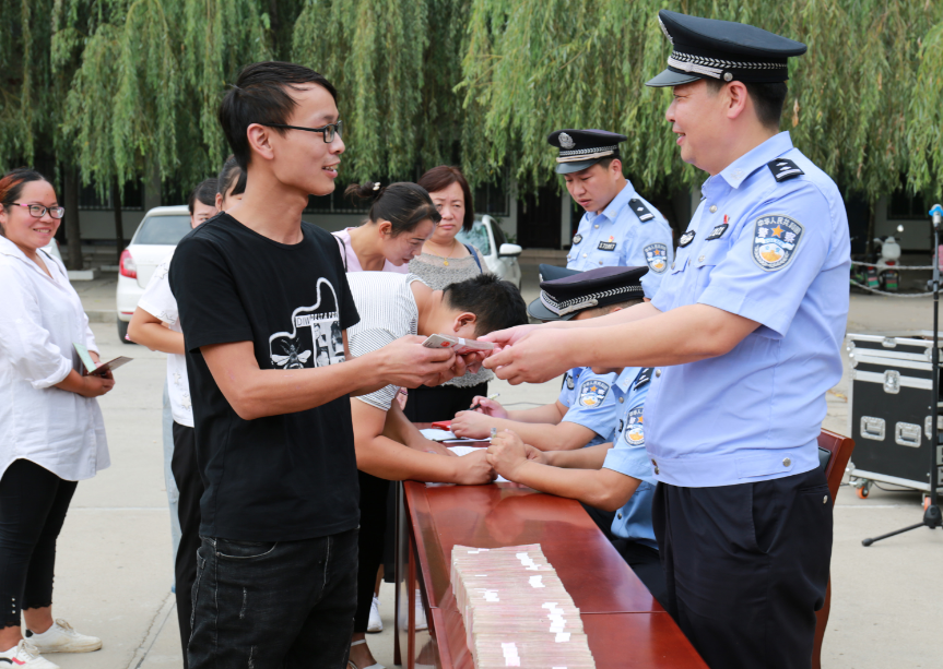 9月6日,扶溝縣公安局舉行公開退贓大會,將“2·28”詐騙案追繳的56萬元現(xiàn)金返還給受騙群眾。