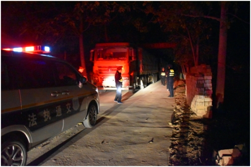 當(dāng)日22時(shí)40分,該所副所長(zhǎng)楊春風(fēng)同志帶領(lǐng)兩個(gè)執(zhí)法中隊(duì),對(duì)縣區(qū)域內(nèi)重點(diǎn)路段24小時(shí)不間斷巡查,在巡查到轉(zhuǎn)樓鄉(xiāng)通往龍曲鎮(zhèn)的X001線時(shí),發(fā)現(xiàn)4輛大型超限車輛,其中3輛為“百噸王”,1輛為嚴(yán)重超載標(biāo)掛。司機(jī)為抗拒檢查,鎖閉車門遠(yuǎn)處觀望,我執(zhí)法人員堅(jiān)守執(zhí)法現(xiàn)場(chǎng),并及時(shí)調(diào)用拖車支援,另指派執(zhí)法人員與司機(jī)溝通,在動(dòng)之以情、曉之以理的講解治超政策下,得到了司機(jī)的主動(dòng)配合,把車輛暫扣至超限車輛卸載點(diǎn)。
