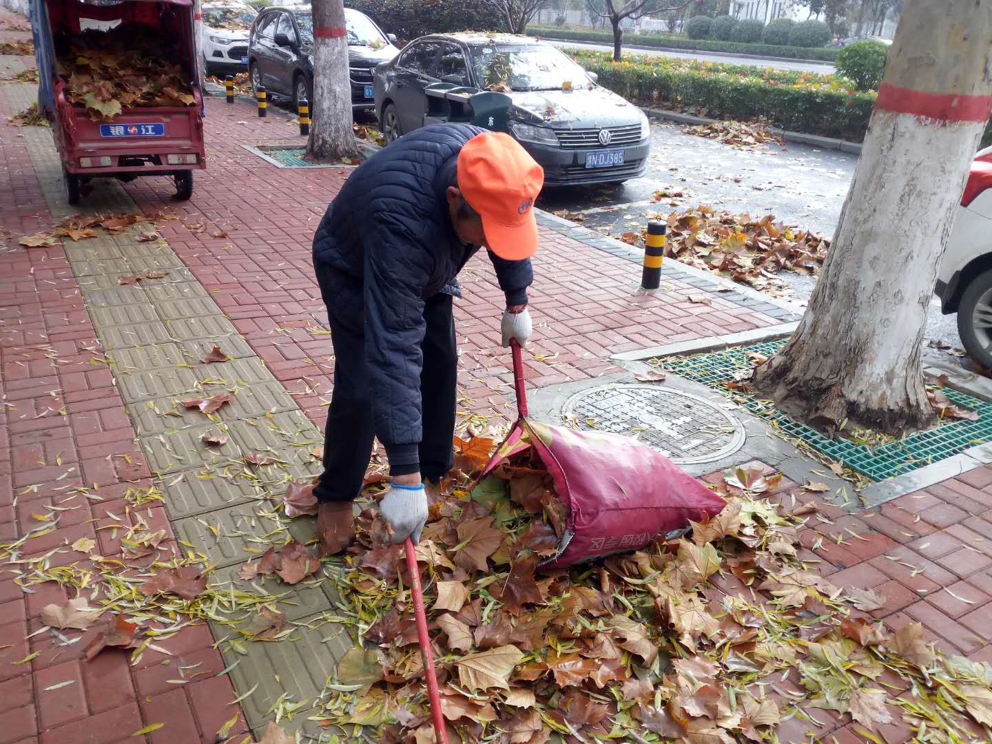 12月3日晚上,周口市中心城區(qū)風(fēng)急雨驟,樹(shù)葉落了一地。4日上午天放晴,環(huán)衛(wèi)工人紛紛上街清掃落葉。負(fù)責(zé)興旺路的環(huán)衛(wèi)工人告訴記者,他以前兩個(gè)小時(shí)就能打掃完,而當(dāng)天他干了3個(gè)小時(shí)還沒(méi)有干完,估計(jì)還得再干1個(gè)多小時(shí)。圖為環(huán)衛(wèi)工人在清掃落葉。