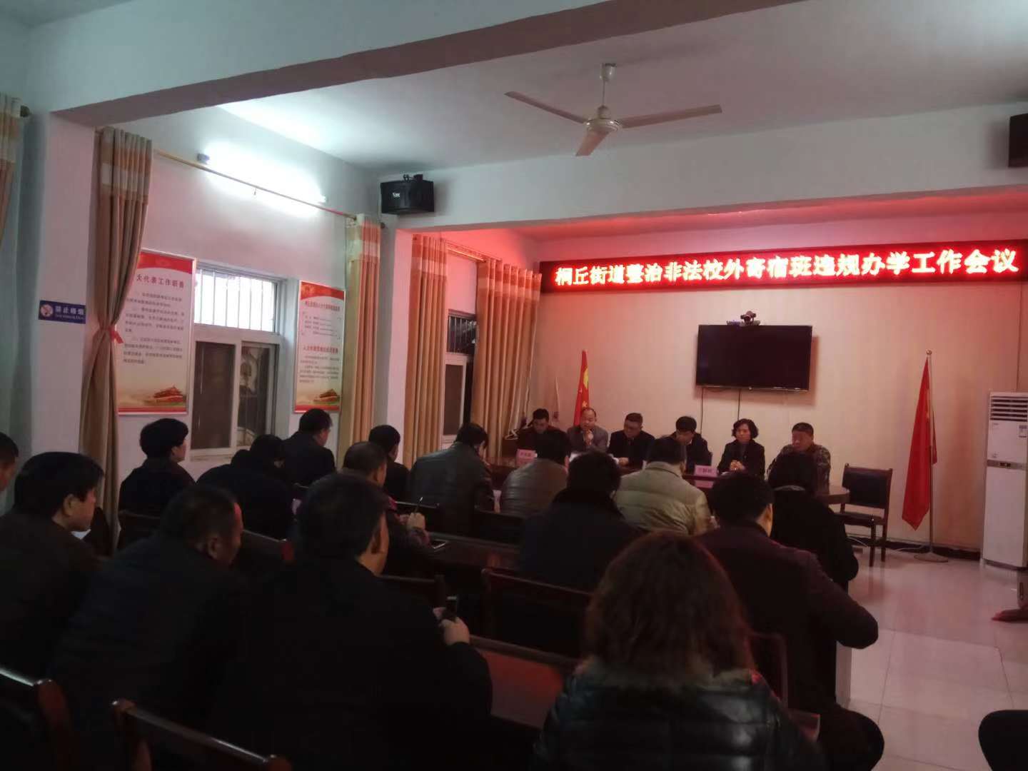 與會人員首先收看了桐丘街道排查非法校外寄宿班安全隱患專題片??h消防大隊指導(dǎo)員李廣華通報城區(qū)非法校外寄宿班情況??h教體局副主任科員李軍峰對各中小學(xué)開展非法校外寄宿班整治工作提出具體工作要求。桐丘街道黨工委書記萬群玲對非法校外寄宿班存在的安全隱患進行詳細講解,對紅旗小學(xué)采取的得力措施表示肯定,并對下步工作作出安排部署。