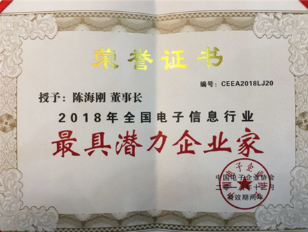 在當(dāng)日下午召開的全國電子信息行業(yè)優(yōu)秀企業(yè)家表彰大會上,公司董事長陳海剛榮獲“2018年全國電子信息行業(yè)最具潛力企業(yè)家”榮譽稱號。