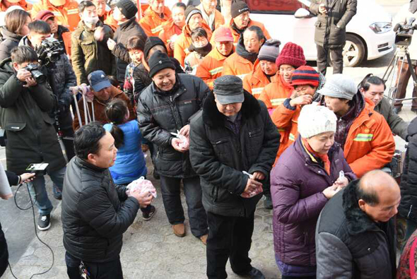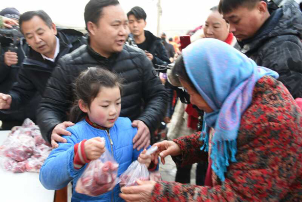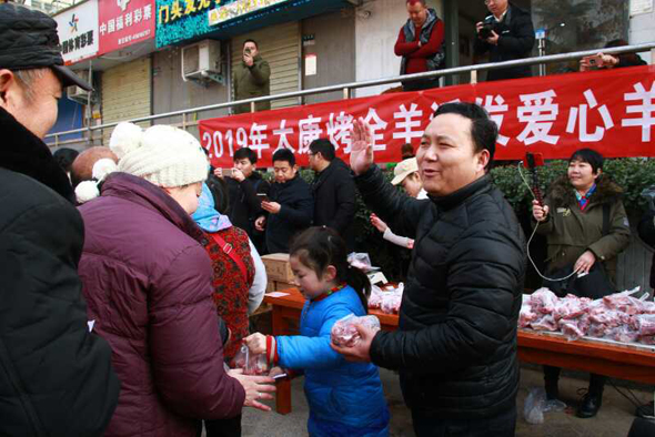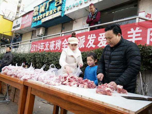 小小燒烤店門前,成了倡導(dǎo)“愛與奉獻(xiàn)主會場”。 2019年1月1日上午10點,新年第一天,鄭州市國基路與豐慶路交叉口太康烤全羊店門口,60多名環(huán)衛(wèi)工、殘疾人、困難群眾等弱勢群體聚集在這里,排隊免費領(lǐng)取“羊肉哥”孫合理和妻子劉曉愛派送的一份新年禮物——愛心羊肉,而這愛舉從2010年元旦開始到如今,已經(jīng)堅持了9年。