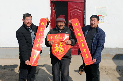 1月24日,扶溝縣白潭鎮(zhèn)王村貧困戶王奎鎖喜滋滋地從縣財(cái)政局扶貧工作人員手中接過對(duì)聯(lián)。為營(yíng)造歡樂祥和、文明有序的節(jié)日氛圍,宣傳扶貧政策,扶溝縣財(cái)政局對(duì)所幫扶7個(gè)行政村開展“情暖萬(wàn)家·迎新春送春聯(lián)”助力脫貧攻堅(jiān)活動(dòng),以此傳達(dá)黨的十九大精神和脫貧攻堅(jiān)精神。