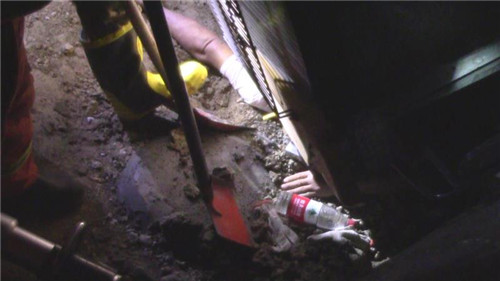 指揮員在與司機(jī)溝通時發(fā)現(xiàn),由于車身很重,司機(jī)手臂很快出現(xiàn)血液流通不暢、知覺微弱現(xiàn)象,如不及時脫困,后果十分嚴(yán)重。情況緊急,救援人員先利用剪擴(kuò)器對駕駛室與被困人員手臂處進(jìn)行擴(kuò)張,但由于車身較重,地面所墊硬物無法承受壓力,擴(kuò)張器無法發(fā)揮作用。隨后,救援人員利用鐵鍬在被困人員手臂下進(jìn)行挖土,5分鐘后,隨著空間的逐漸擴(kuò)大,被困人員手臂被小心翼翼抽回,司機(jī)成功脫困,消防指戰(zhàn)員從駕駛證另一側(cè)把他救出。