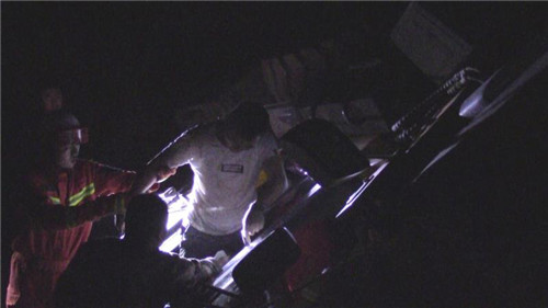 當(dāng)夜,消防指戰(zhàn)員接到調(diào)派命令后迅速趕往事故現(xiàn)場。指揮員觀察了解得知,側(cè)翻的是一輛重型推土車,由于作業(yè)區(qū)地面不平,司機(jī)在倒車時車輛發(fā)生側(cè)翻,欲打開車門跳車未果,左臂反而被車輛駕駛室一側(cè)死死壓在地面上,無法動彈。當(dāng)時工地上沒有同事,周邊也沒有行人,呼救無應(yīng)后,司機(jī)忍著巨烈疼痛摸到手機(jī)電話求救。