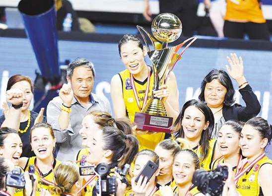 5月5日,瓦基弗銀行隊(duì)球員朱婷(中上)邀請父母進(jìn)入球場慶祝奪冠。 當(dāng)日,在2018-2019賽季土耳其女排超級聯(lián)賽決賽第五回合比賽中,瓦基弗銀行隊(duì)客場以3比0戰(zhàn)勝伊薩奇巴希隊(duì),以總比分3比2成功衛(wèi)冕聯(lián)賽冠軍。朱婷也蟬聯(lián)了聯(lián)賽MVP(最有價(jià)值球員)稱號。 新華社記者 徐速繪 攝