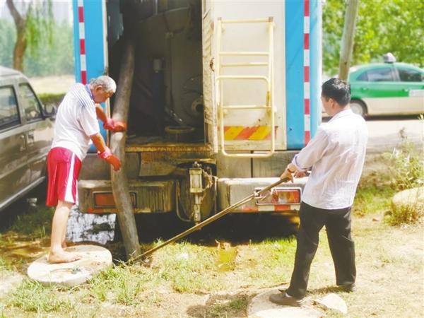 站在公廁旁的污水邊,該負(fù)責(zé)人指揮專門處理糞液的車輛到達現(xiàn)場,并就該公廁的情況向記者進行說明?!斑@個公廁是由市園林處負(fù)責(zé)修建的,建好投入使用的時候就沒有鋪設(shè)污水管道,只配套了一個能容納9立方米污水的化糞池。因為附近有小廣場,健身的市民多,公廁使用的頻率高,一個化糞池不夠用,我們又增加了一個能夠容納10立方米污水的化糞池,定期進行清理。”該負(fù)責(zé)人說。