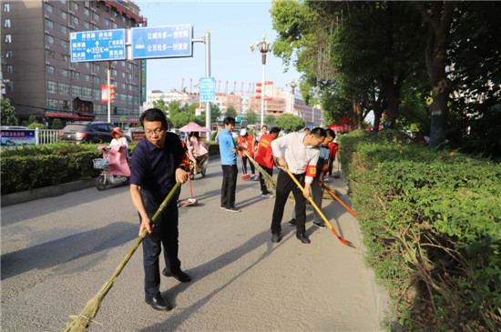 6月4日,烈日炙烤著大地,氣溫升至37攝氏度,路面溫度更高。鄲城縣財政局長張振新帶領“創(chuàng)衛(wèi)”值班人員,正在新華路西段責任區(qū)內(nèi)清掃路面、撿拾落葉、噴灑花木、落實“門前五包”……大家忙得汗流浹背,始終無一人脫崗。