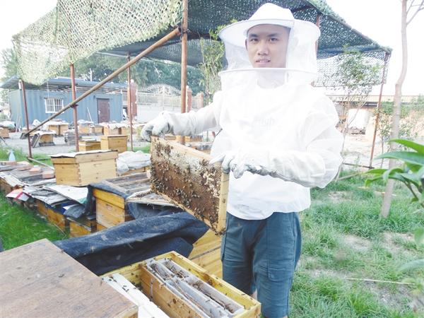 6月24日,沈丘縣付井鎮(zhèn)九里村的退伍軍人蘇尚方,正小心翼翼地從蜂箱里取出蜂蜜板,準備采收蜂蜜?!拔茵B(yǎng)了120多箱蜜蜂,年產蜂蜜3000多公斤,經濟收入十分可觀?!碧K尚方說,他專門成立了蘇家養(yǎng)蜂專業(yè)合作社,帶領當?shù)刎毨粢黄鹈撠氈赂弧Vx辛凌 攝