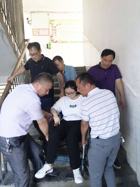 “考慮到她行動不便,我們適當地調整了桌子之間的距離?!绷_明中表示,兩天來,晉淼在實驗中學考點服務工作人員的幫助下,從一樓抬進三樓考場。每場考場結束后,考點工作人員又把她從三樓抬下來,推到家長身邊。