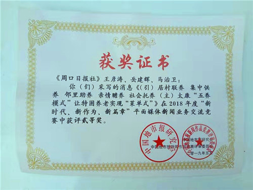 中國地市報新聞獎評選活動由中國地市報研究會主辦,每年舉辦一次,在全國有著廣泛的影響,此項新聞獎評選活動涉及全國幾乎所有地市黨報,不僅是展示地市黨報形象的重要舞臺,也是衡量地市黨報辦報水平的重要標志,同時也是以新聞的形式展示各地亮點工作的重要。《太康“五養(yǎng)模式”讓特困養(yǎng)老實現“菜單式”》稿件在此項新聞獎評選中,同樣表現不凡,最終榮獲中國地市報新聞獎二等獎。
