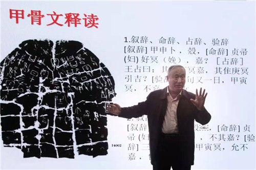 接著,在歷時(shí)兩個(gè)半小時(shí)的分享中,郝教授以融合發(fā)現(xiàn)、甲骨文字拆分、甲骨文書(shū)風(fēng)及甲骨文書(shū)法創(chuàng)作為立足點(diǎn),襯以個(gè)人習(xí)書(shū)作品,從文化本義的內(nèi)涵、文化本義的要素、文化的生成和甲骨文的演化和發(fā)展等方面詳細(xì)闡述了文化的來(lái)源以及人類(lèi)社會(huì)進(jìn)步的過(guò)程。