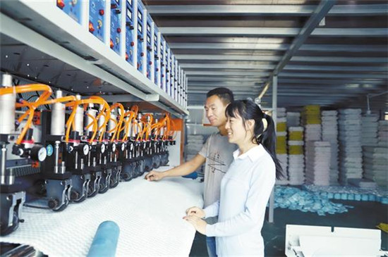 圖為10月18日,朱高偉夫妻倆在扶貧車間查看機(jī)器運(yùn)行情況。