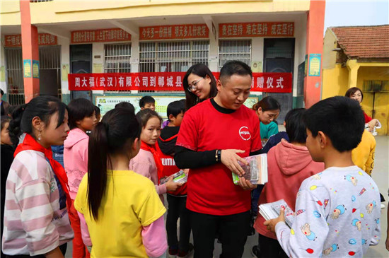 10月24日,周大福河南區(qū)域負(fù)責(zé)人岳磊一行15人,帶著書包、文具、足球、藍(lán)球等學(xué)習(xí)用品,來到鄲城縣丁村鄉(xiāng)徐莊小學(xué),為200余名學(xué)生送來了愛心大禮包。并為兩戶貧困戶送去了米面油等慰問品。