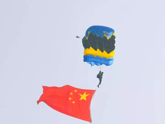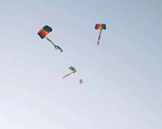 “看,跳傘表演開始了?!?0月29日上午,周口西華通用機場首航儀式結束后,一場精彩絕倫的飛行表演就開始了。載著跳傘運動員的飛機起飛到指定地點后,運動員攜帶著國旗和彩帶從高空中跳下,打開傘包后,空中五顏六色十分漂亮,引得圍觀群眾不時叫好。