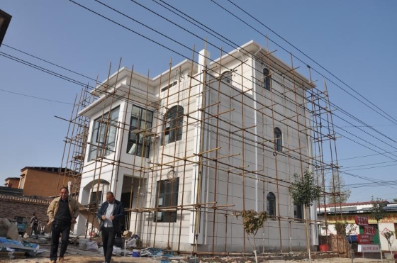 11月20日,在全國(guó)文明村——商水縣巴村鎮(zhèn)上城村,村民朱云山家的3層輕鋼別墅正在建造中。這是該村第一幢新式別墅,全框架結(jié)構(gòu),造型別致,沒(méi)有使用砂石、水泥、磚瓦等,全部使用新型環(huán)保建材,建造過(guò)程就像搭積木一樣,并具有節(jié)能環(huán)保、防風(fēng)抗震、隔音防火、造價(jià)低廉、建造快等特點(diǎn),很受喜歡。圖為附近村民前來(lái)參觀。記者 付永奇 攝